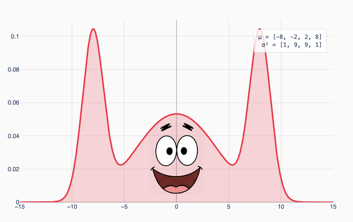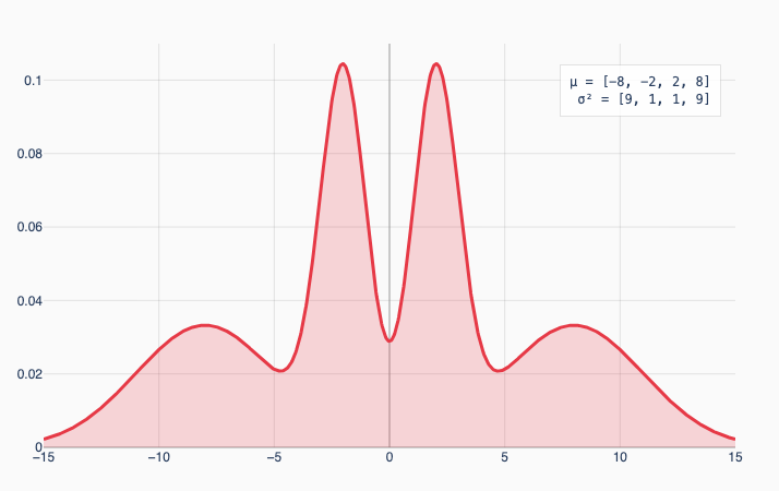 Let’s concretely say we have an equal mixture of 4 Gaussians with means -8, -2, 2, and 8. If the 2 outer Gaussians have variance 9 and the inner Gaussians have variance 1, you get this distribution: